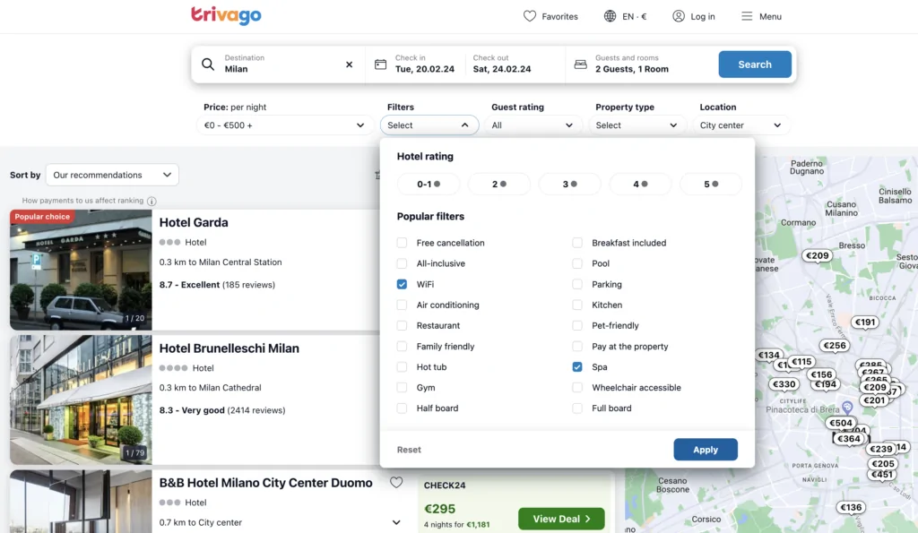 Trivago helps travelers compare accommodation deals across 190 countries. It’s one of the most extensive web hotel search engines, bringing excellent customer service and strikingly accurate reviews. Offerings range from luxury suites to boutique hotels and budget hostels.